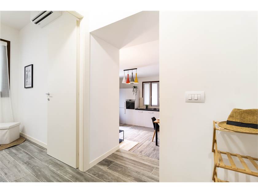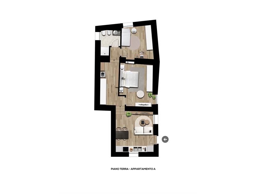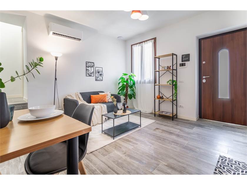 A piano terra è disponibile un trilocale accogliente e funzionale: l’ingresso si apre su una luminosissima zona giorno con cucina a vista, mentre la zona notte ospita due camere pensate per garantire benessere e tranquillità — una matrimoniale e una perfetta come cameretta, studio o stanza per gli ospiti. Un bagno moderno e curato nei dettagli, completa la disposizione interna.