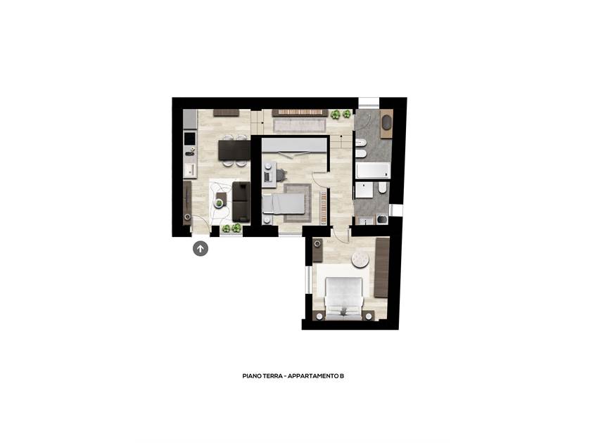 L’appartamento, posto a piano terra, accoglie con una luminosa zona giorno open space con cucina a vista, ideale per vivere e condividere momenti di convivialità.
