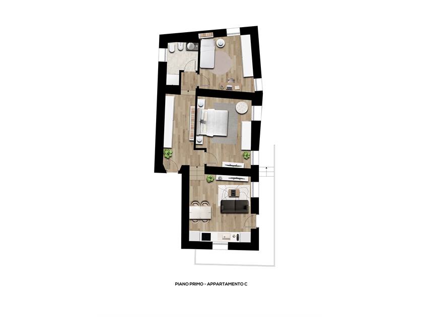 L’appartamento, posto al primo piano, accoglie con una luminosa zona giorno open space con cucina a vista, due camere da letto, bagno finestrato e balcone privato.