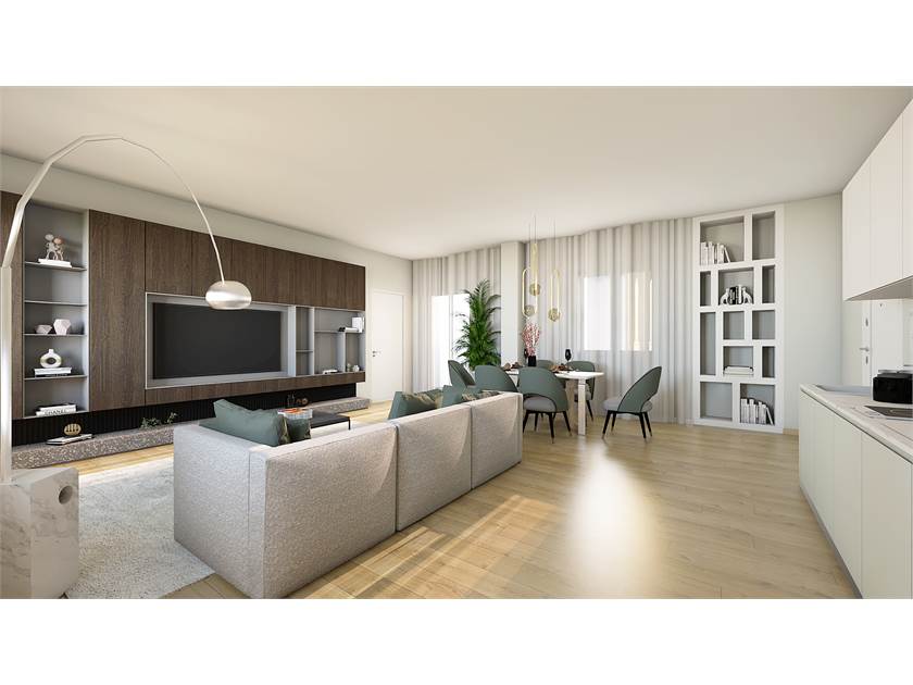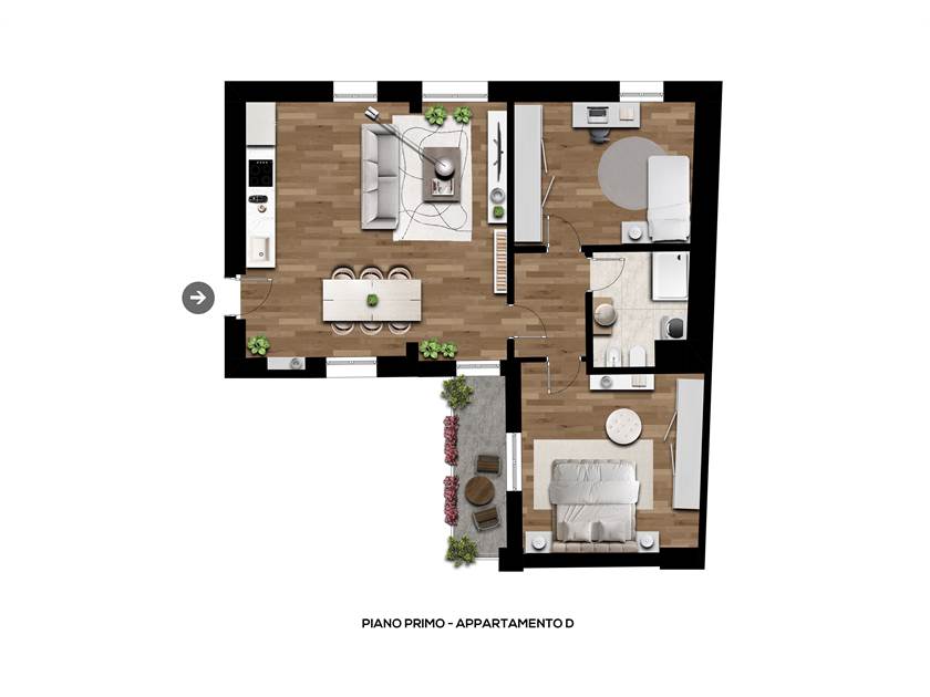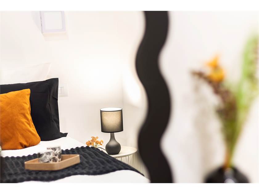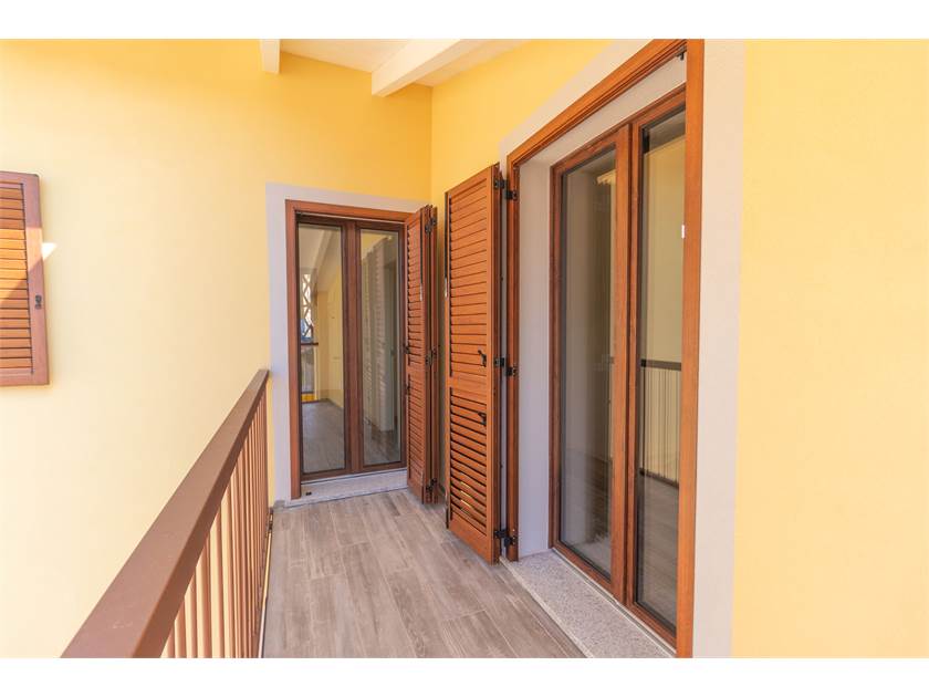 L’appartamento, posto al primo piano, si apre su una luminosa zona giorno open space con cucina a vista, due camere da letto, bagno finestrato e balcone privato.