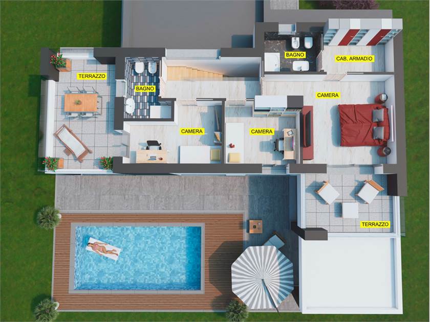 Piano Primo: Al piano superiore, la zona notte è composta da due camere singole, una delle quali con accesso a un terrazzo privato, e un bagno con doccia. La spaziosa camera matrimoniale dispone di un ampio bagno en-suite, una cabina armadio e un terrazzo esclusivo.