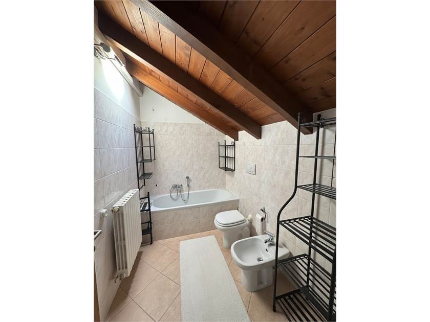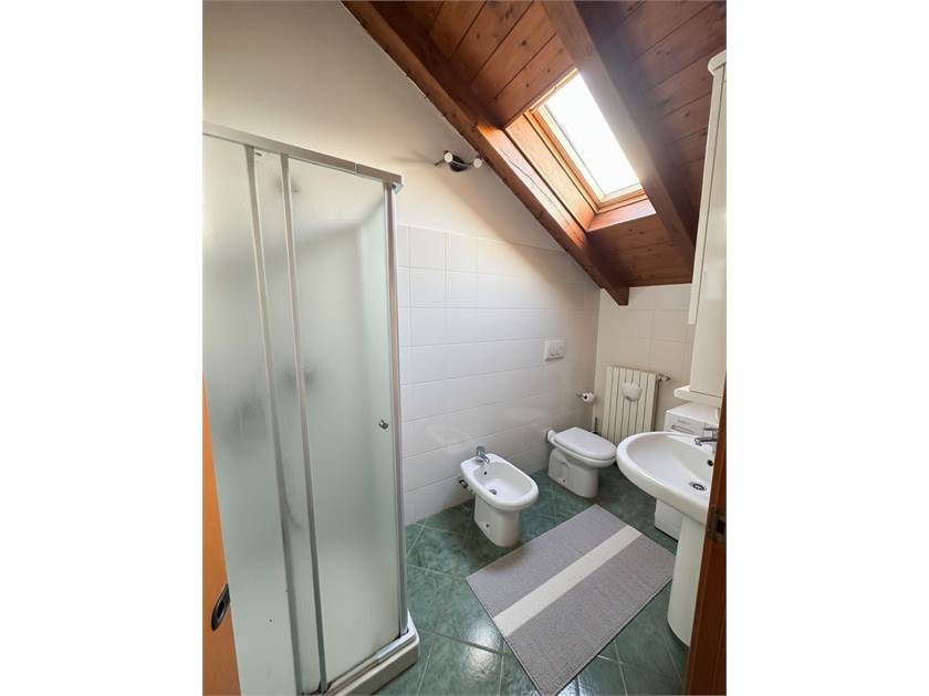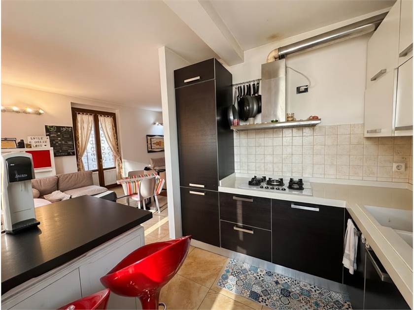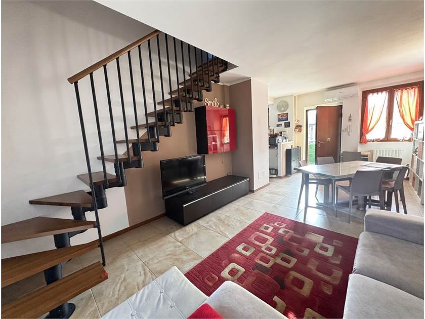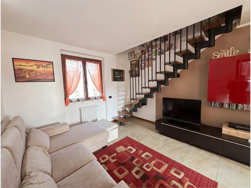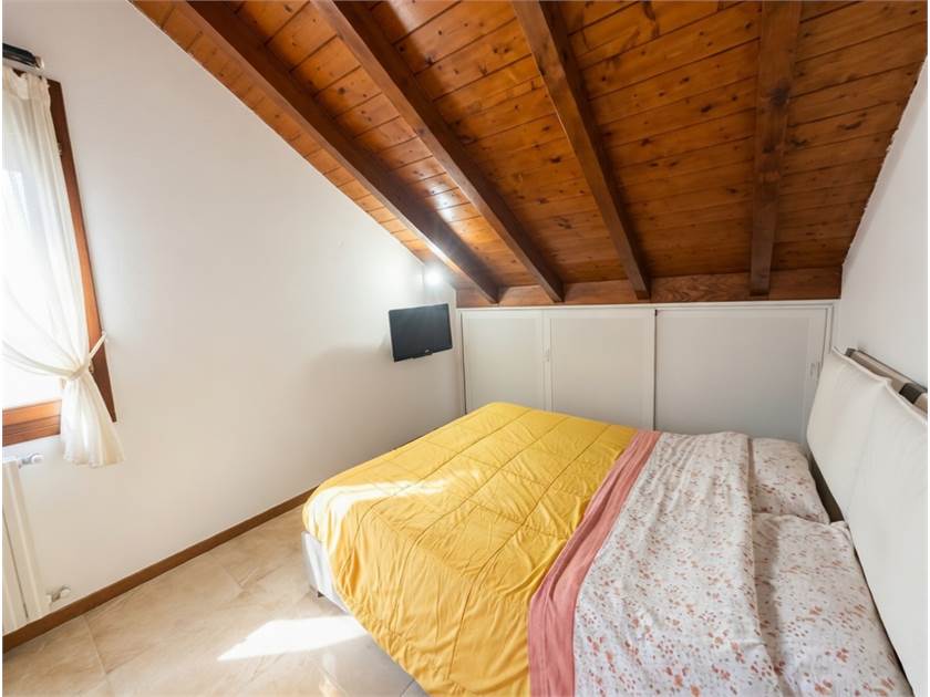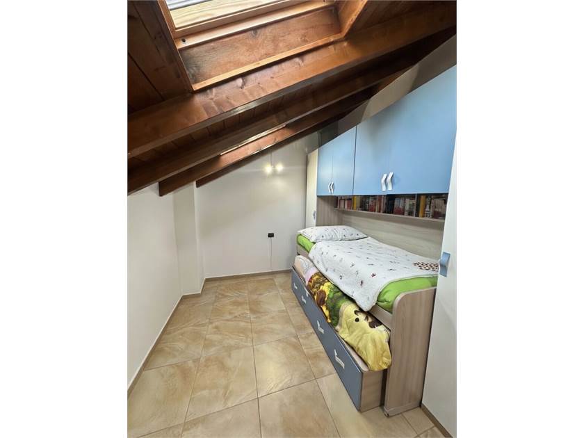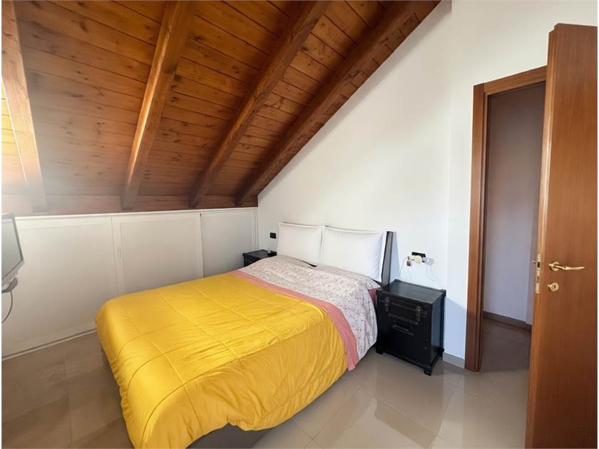 L’appartamento si trova al primo piano ed è così composto: al primo livello troviamo un luminoso soggiorno con cucina a vista; al secondo livello si sviluppa la zona notte, composta da una camera da letto matrimoniale con cabina armadio e bagno in suite, un altro bagno, e una camera singola ideale come studio, camera degli ospiti o cameretta per i figli.