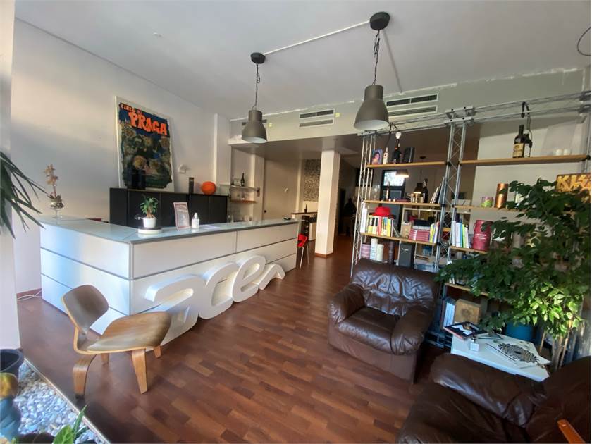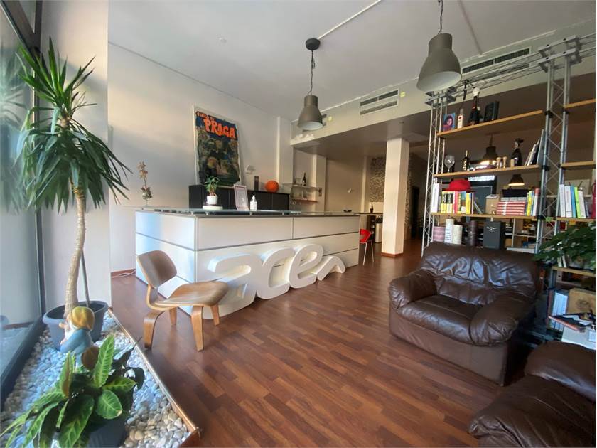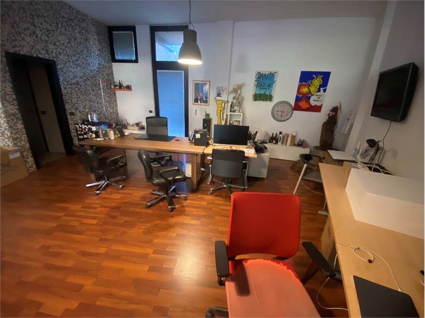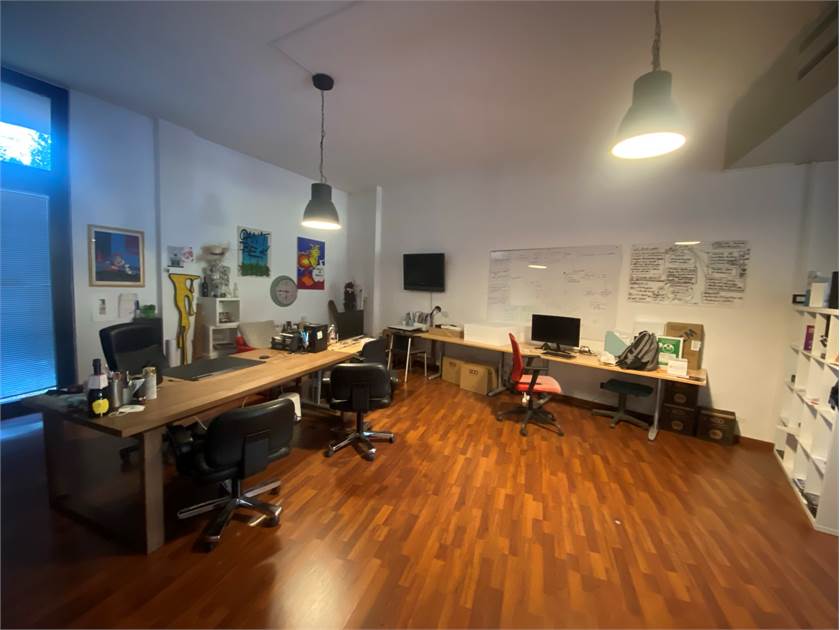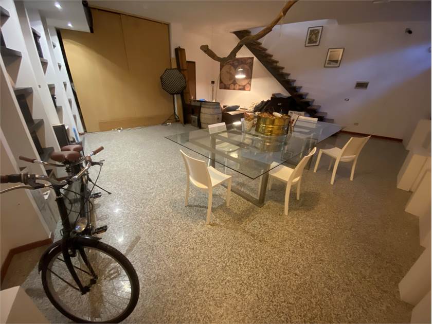 Questo ambiente si apre al piano terra in un luminoso open space con servizio e antibagno, con pavimentazione in parquet; al piano interrato un'altro open space con luce ed aerazione dirette.