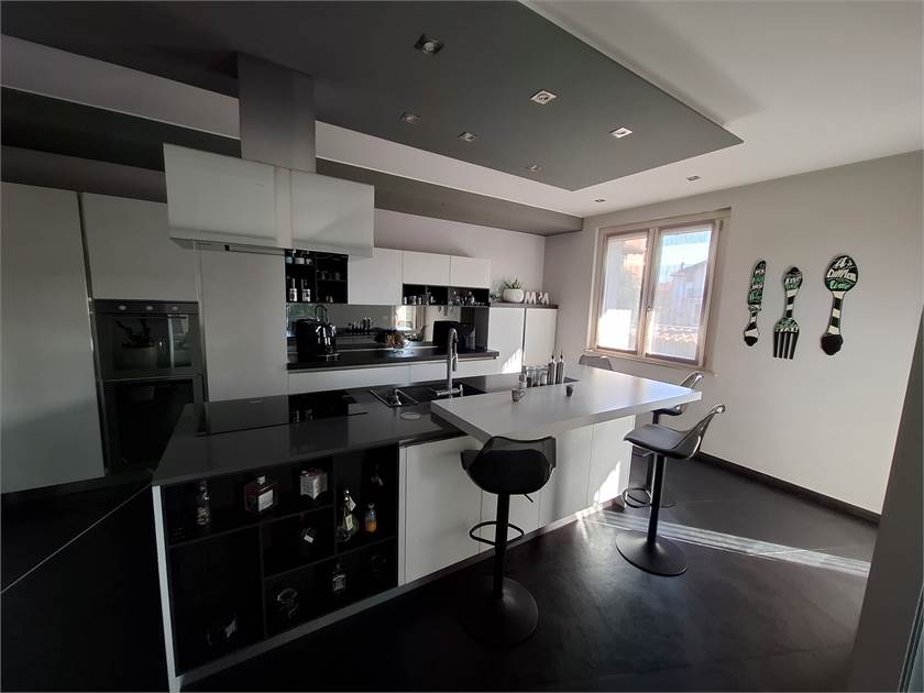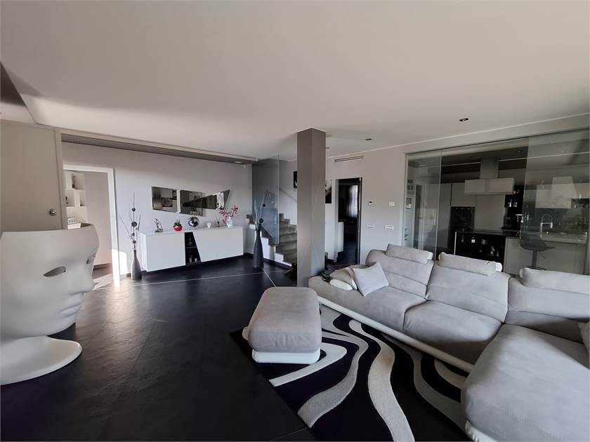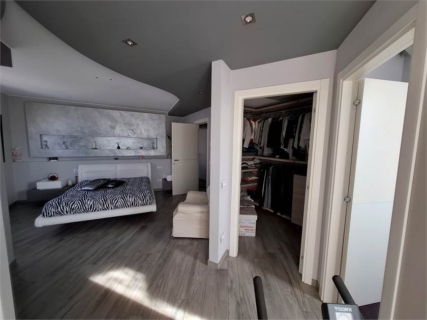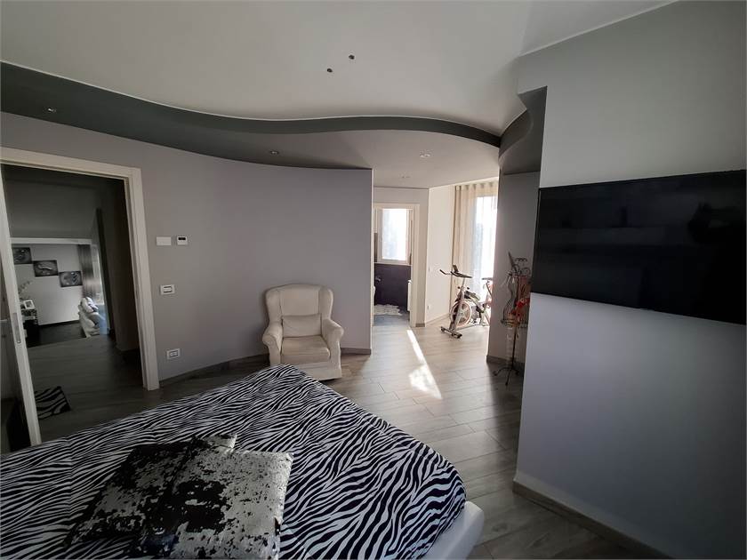 Il piano abitativo principale è il piano rialzato, dove troviamo il soggiorno molto grande, con vetrate sull' ampio terrazzo, cucina abitabile con bellissima penisola, dal soggiorno si accede al bagno di servizio, con ampia vasca doccia, tramite pochi gradini si accede alla zona notte, dove troviamo una camera matrimoniale con angolo palestra, il bagno, doppia cabina armadio, e una doccia/sauna tutta in mosaico, oltre ad una ulteriore camera, ideale anche come studio.
